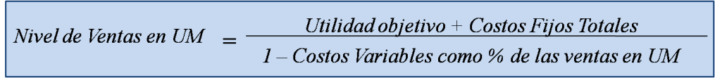 Además de la Ecuación #2, el nivel de ventas necesario para lograr una utilidad objetivo puede expresarse también en unidades monetarias (UM). La Ecuación #3 muestra la forma de calcularlo:
