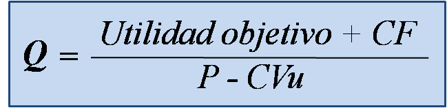 La Ecuación #1 muestra de forma algebraica cómo la utilidad puede conocerse a partir del precio de ventas (P), el costo variable unitario (CVu), los costos fijos totales (CF) y un nivel de ventas específico (Q). El nivel de ventas necesario para alcanzar la utilidad objetivo puede calcularse a partir del despeje de Q en la Ecuación #1, en consecuencia se obtiene como resultado: